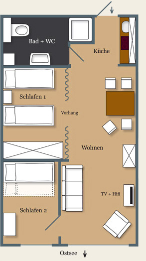 Das Apartment ist mit 4 Personen beziehbar. Es gibt einen Schlafbereich mit Einzelbetten für die Eltern, sowie ein separates Schlafzimmer für die Kinder. Das abgebildete Bett ist ausziehbar und so können bis zu zwei Kinder darin schlafen.